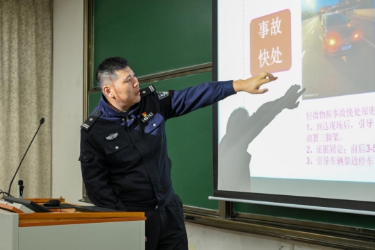 培训由理论授课和实训实操两部分组成。在理论授课环节,高警官以“轻微道路交通事故处置流程”为主题,从“学院周边交通事故情况”“常见交通事故认定”“现场保护及前期处置流程”三个方面,结合鲜活的事例用生动平实的语言为参训人员进行了深入浅出的讲解,讲授内容丰富,图文并茂,对交通管理工作提供了专业性指导。
