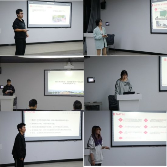 述职大会首先由每位干部依次上台,从思想、工作、学习、生活及存在不足等五方面对考察期情况进行述职汇报;述职期间,两位老师对汇报学生干部进行了现场提问;最后,老师及学生干部根据工作联系关系对相应干部进行了现场评分。
