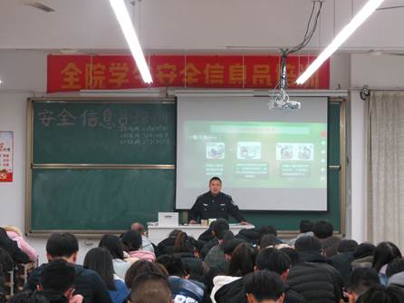 12月7日,保卫处邀请辖区东浦派出所副所长陈诚,对全院100多名班级安全信息员进行业务培训。培训从安全信息员工作职责、日常安全防范知识、安全隐患反馈等方面,要求信息员切实发挥信息员、安全员的作用,为“平安校园”建设奉献一份力量。